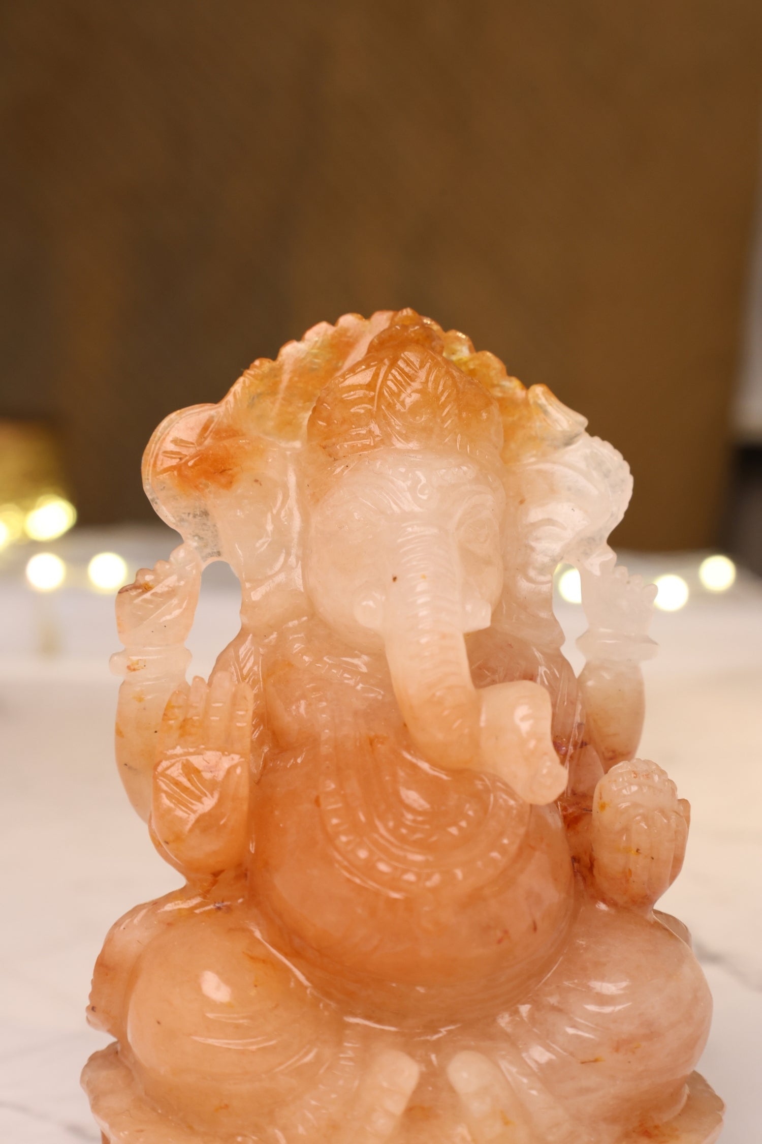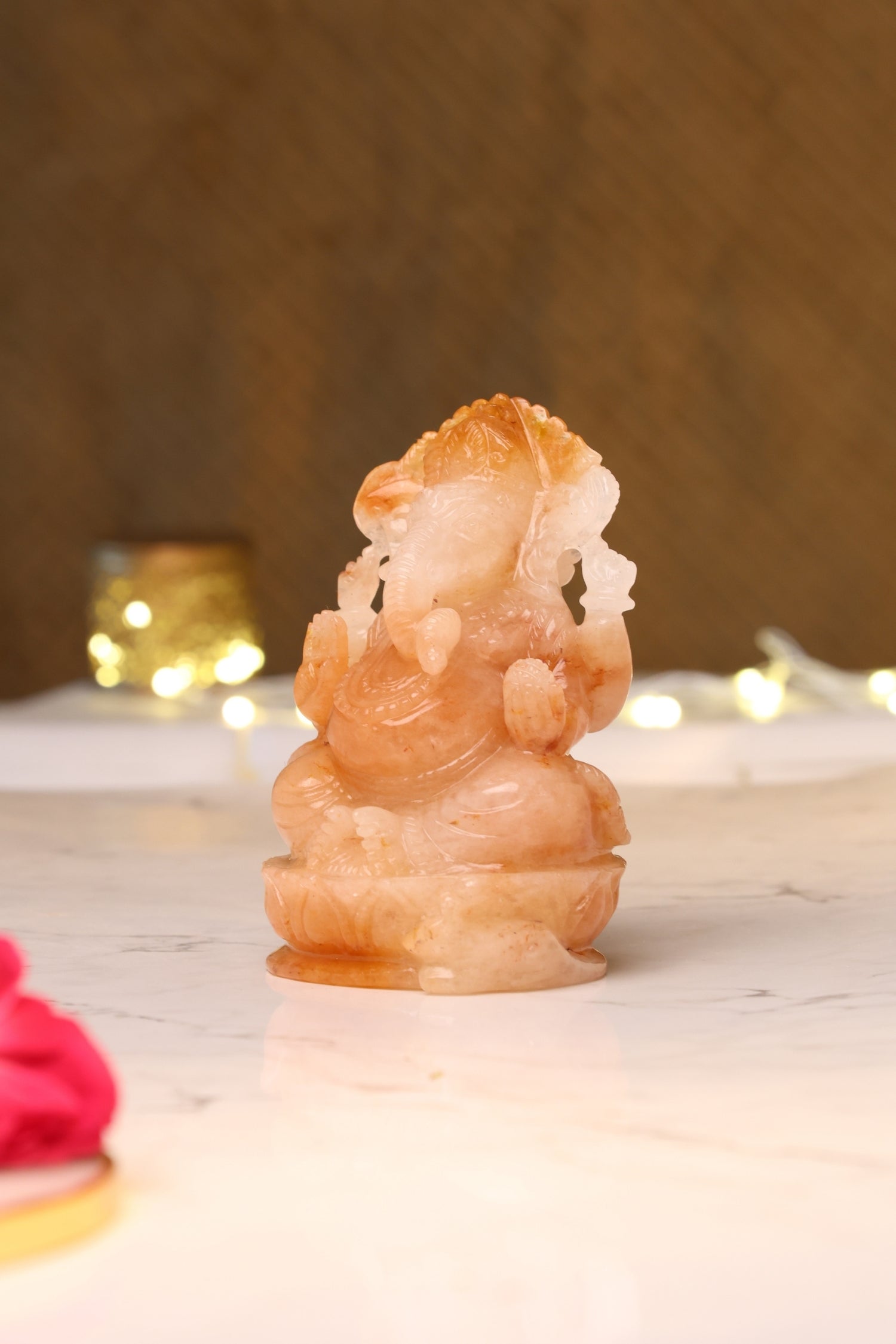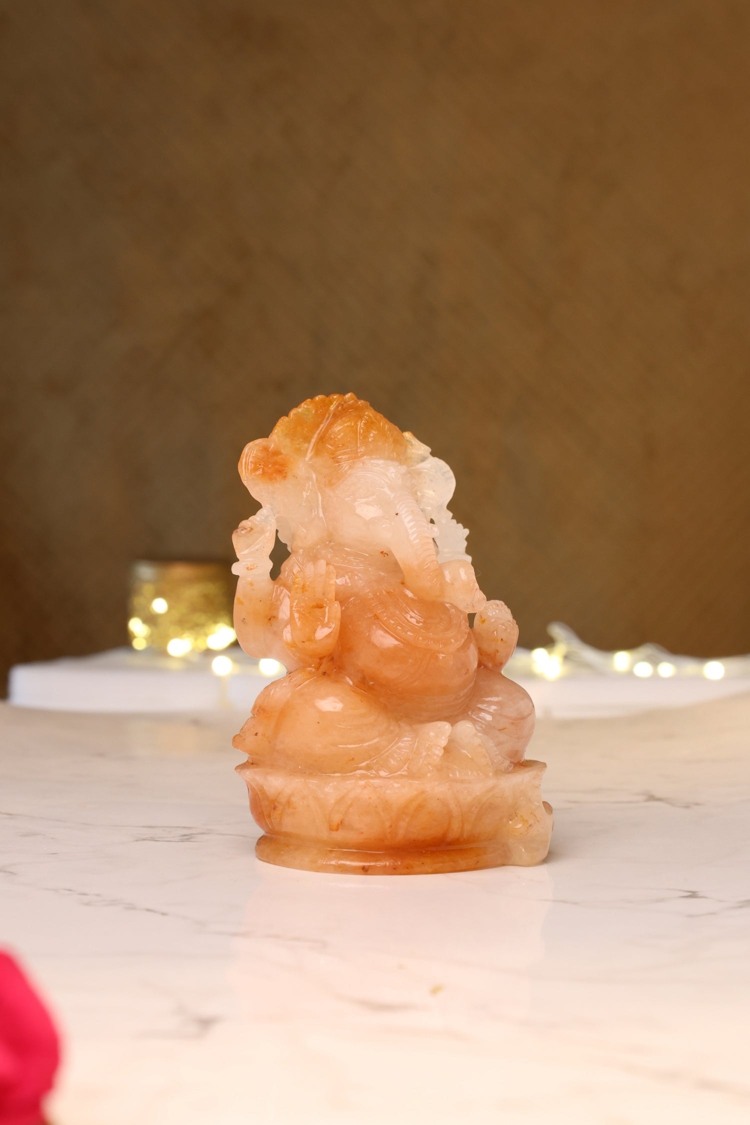 IDOL: Attributed as the harbinger of good luck, Ganesha is widely revered as the remover of obstacles and the god of intellect and wisdom. As the god of auspicious beginnings, he is honored at the start of rites & ceremonies. This beautiful sculpture of lord Ganesha is hand-carved from natural semi-precious stone.