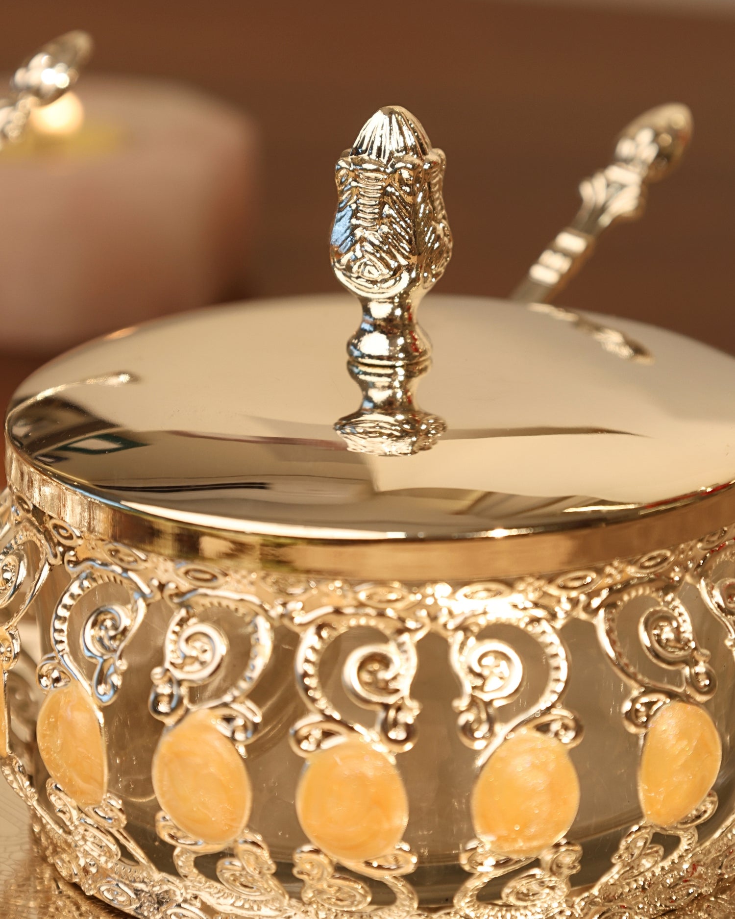 Pair of enamel candy jars with oval tray (Peach)