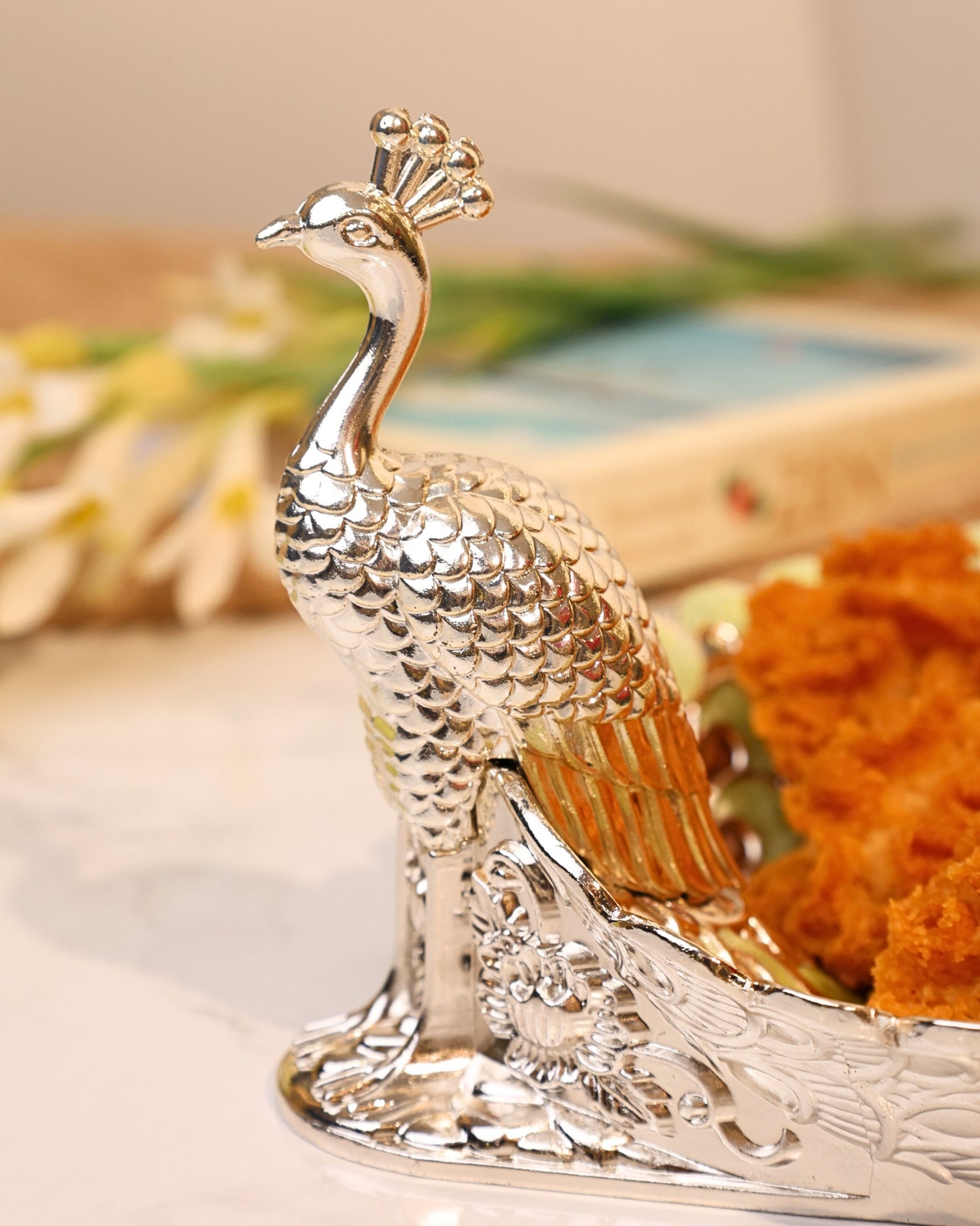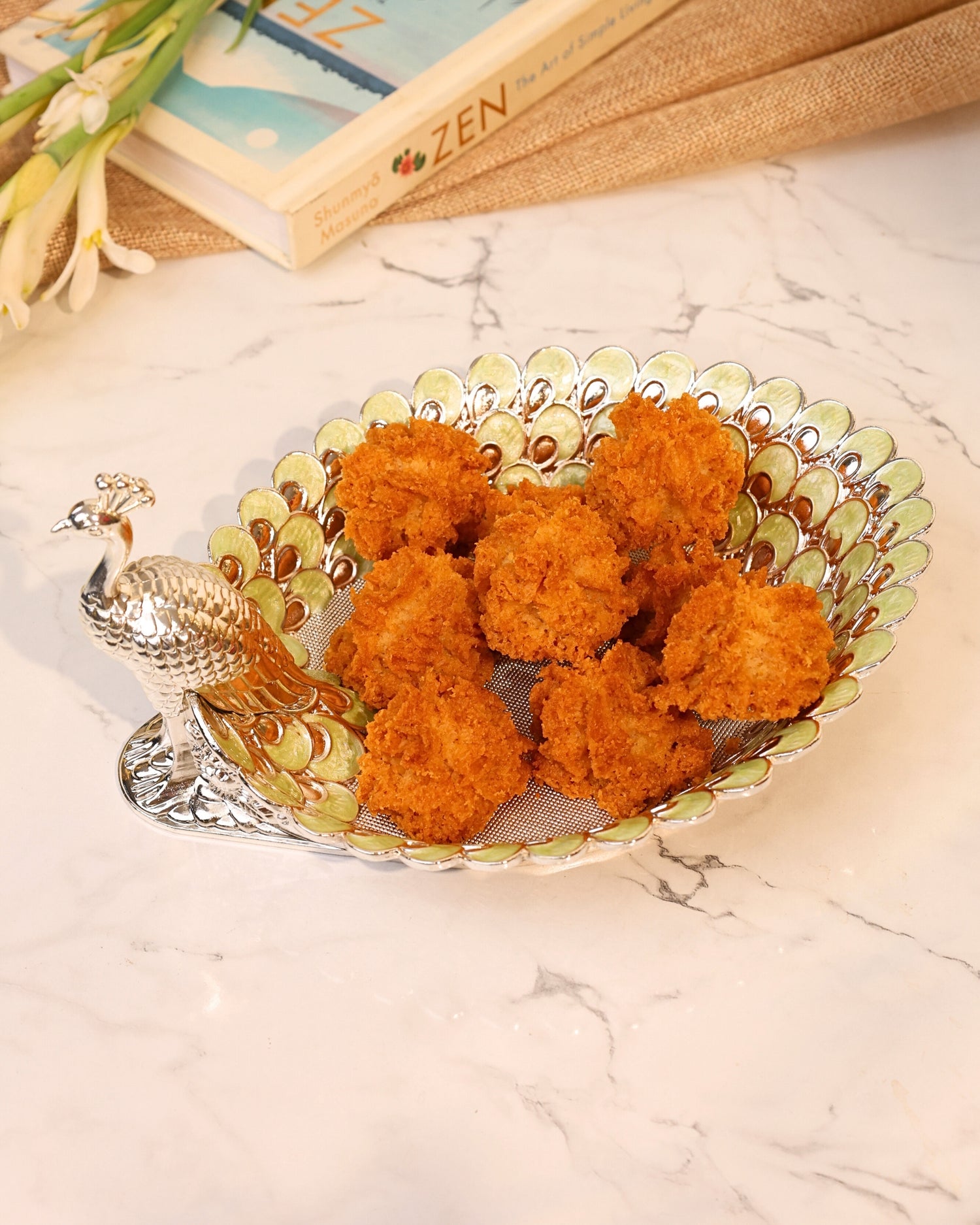 Inspired by the beauty of peacock feathers, this platter adds a touch of elegance to any setting. Perfect for serving or as a statement piece in your decor.