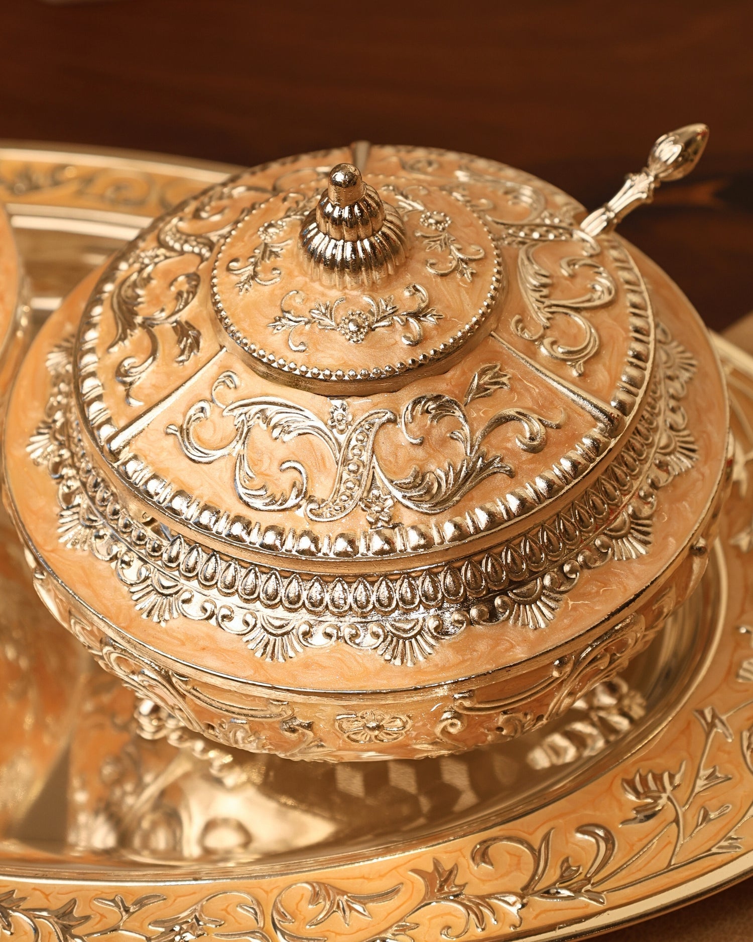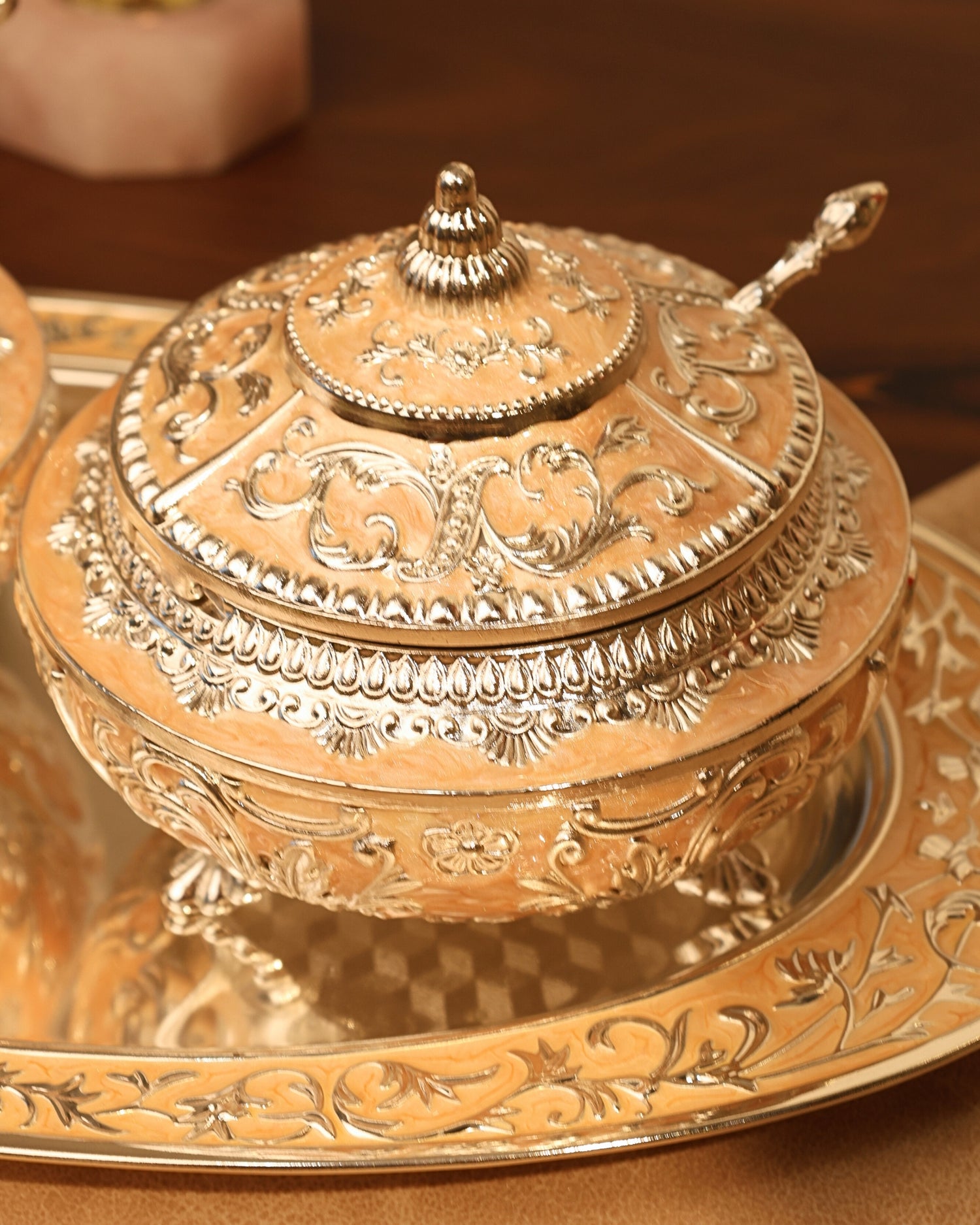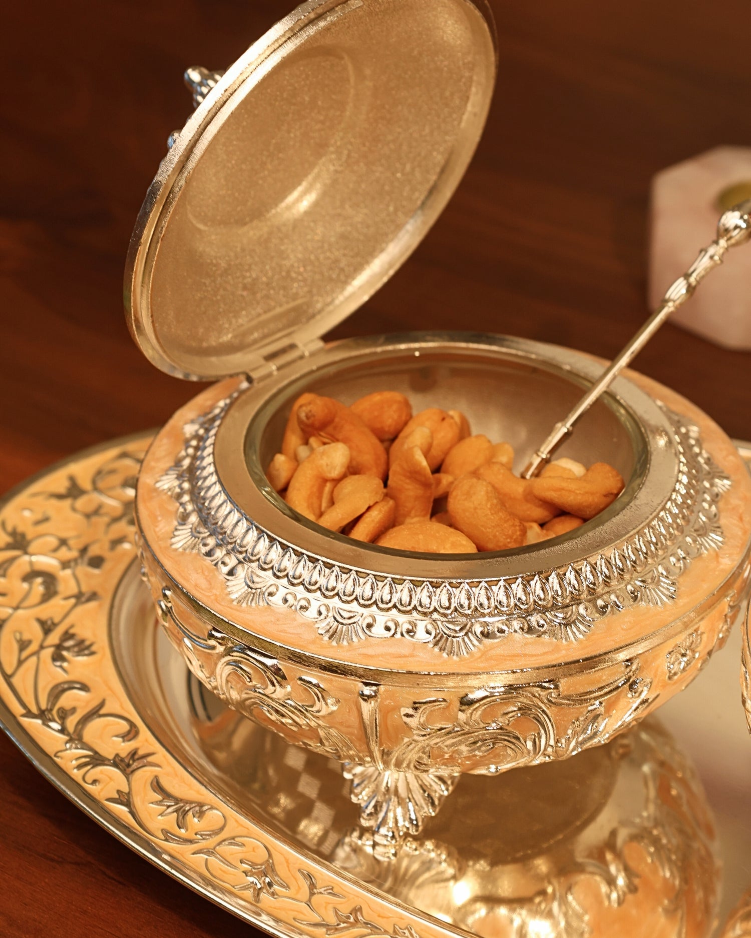 Ornate bowls reminiscent of old times are carefully sculpted and detailed with sinuous floral pattern and a silver structured nob.
