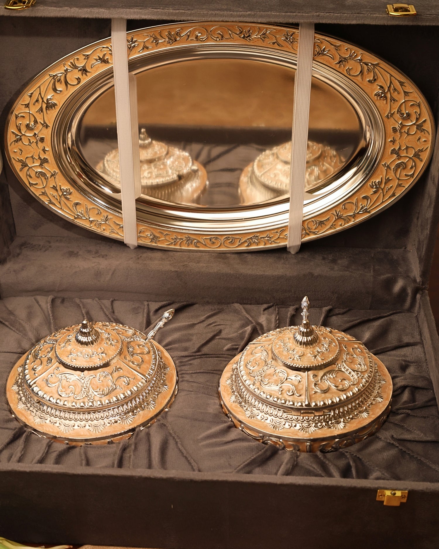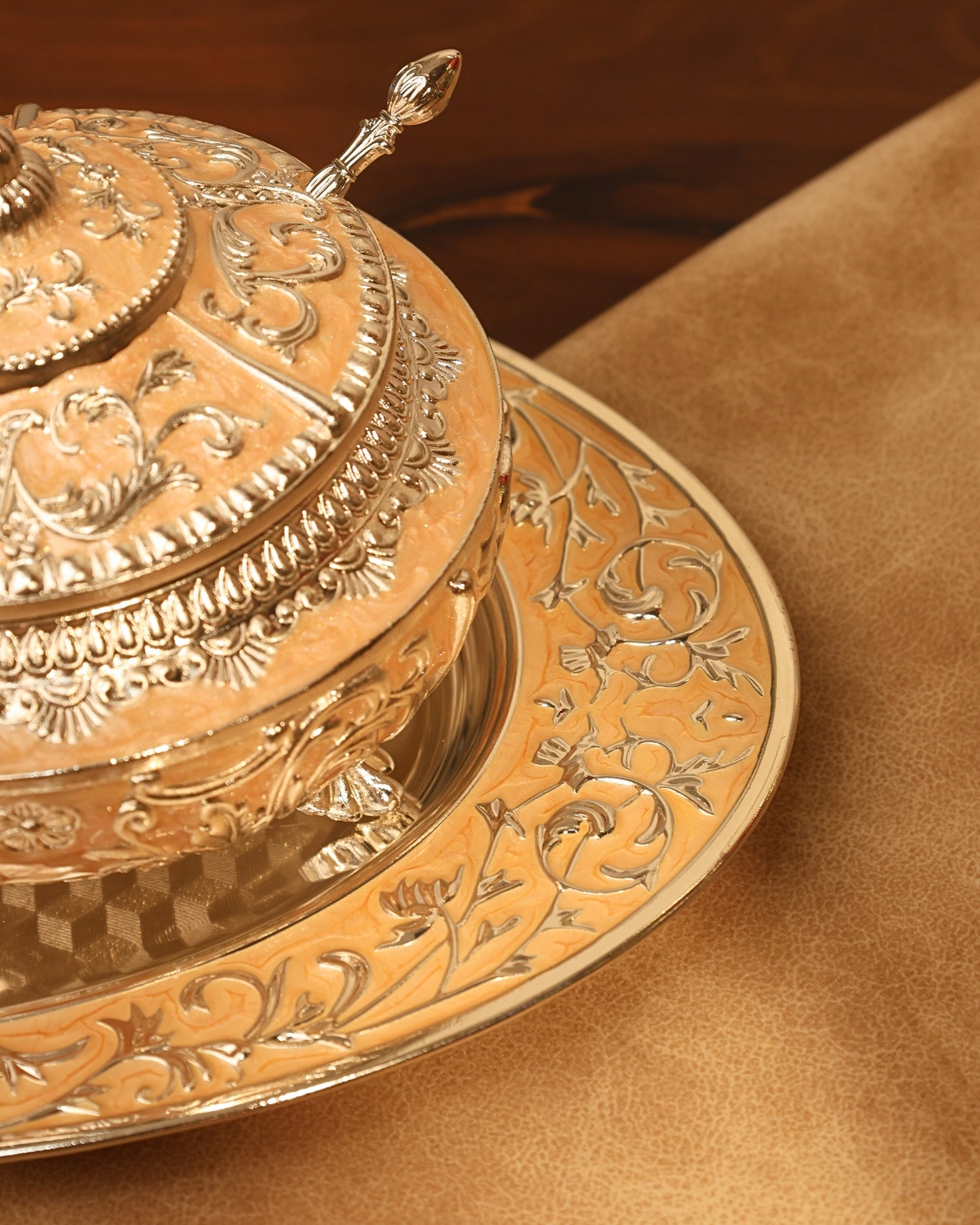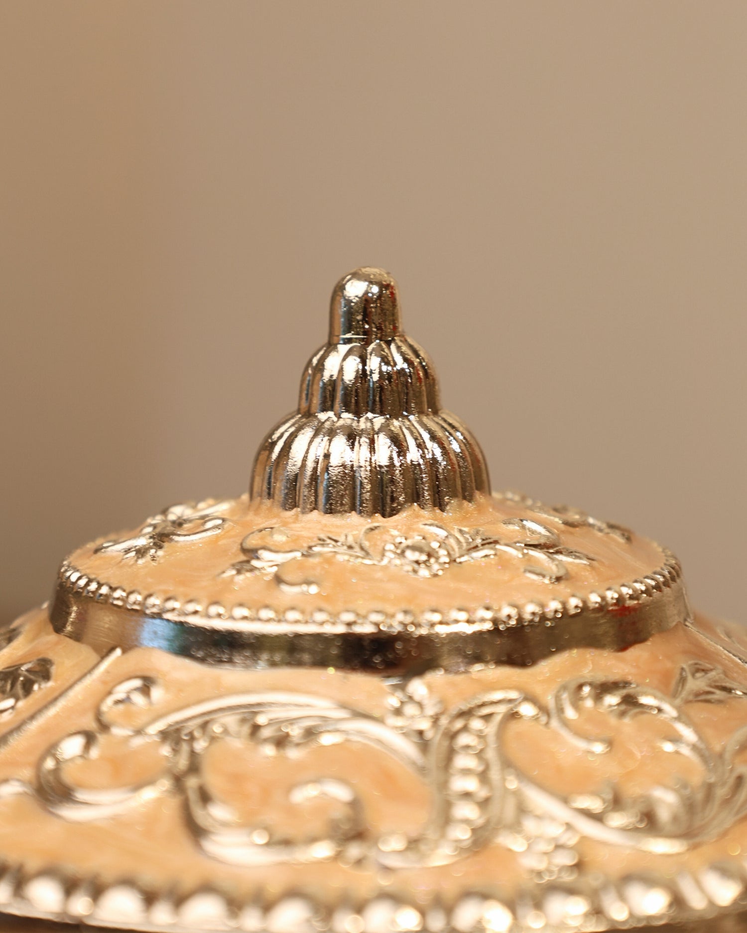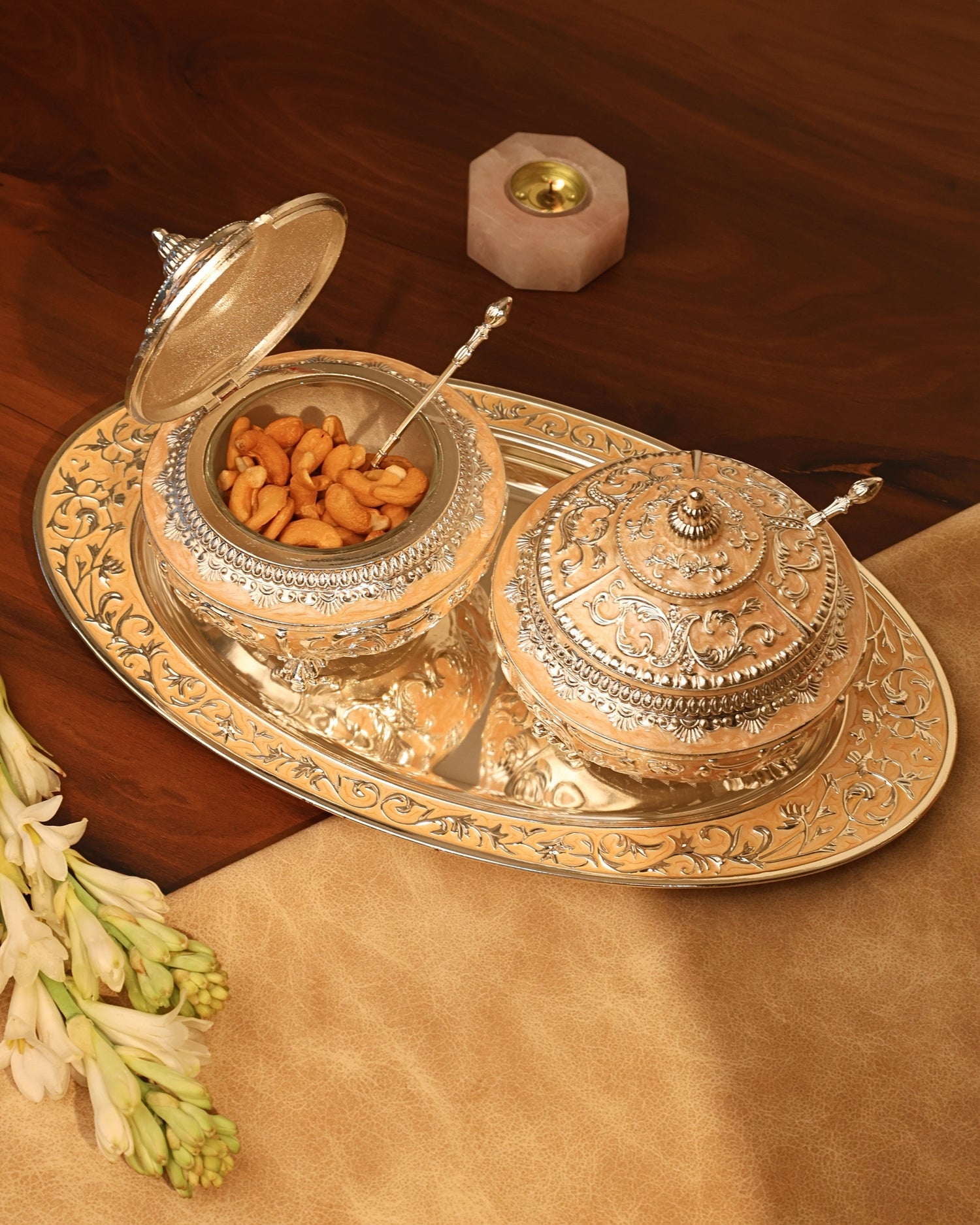 Ornate bowls reminiscent of old times are carefully sculpted and detailed with sinuous floral pattern and a silver structured nob.