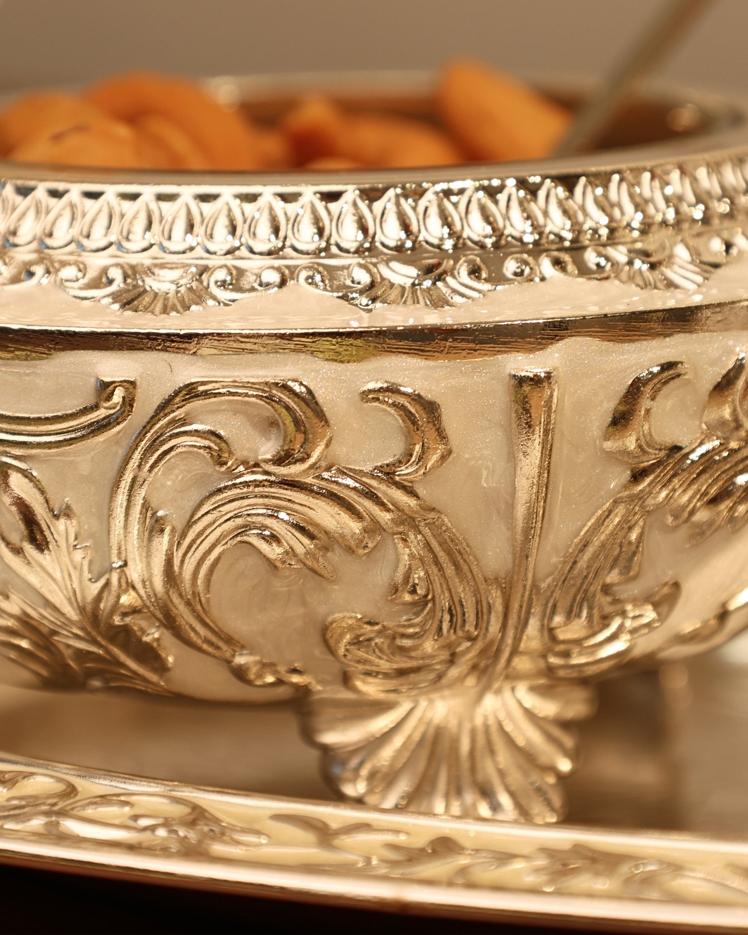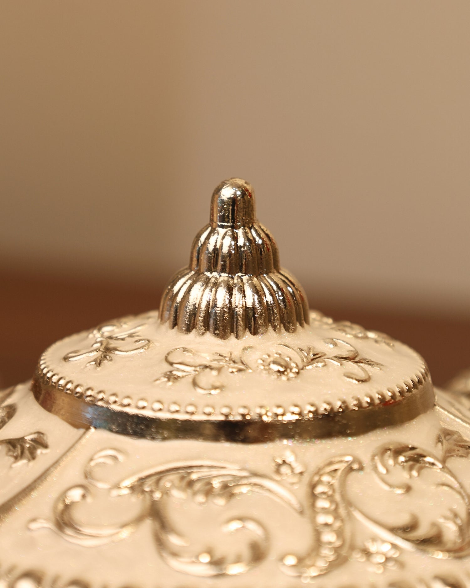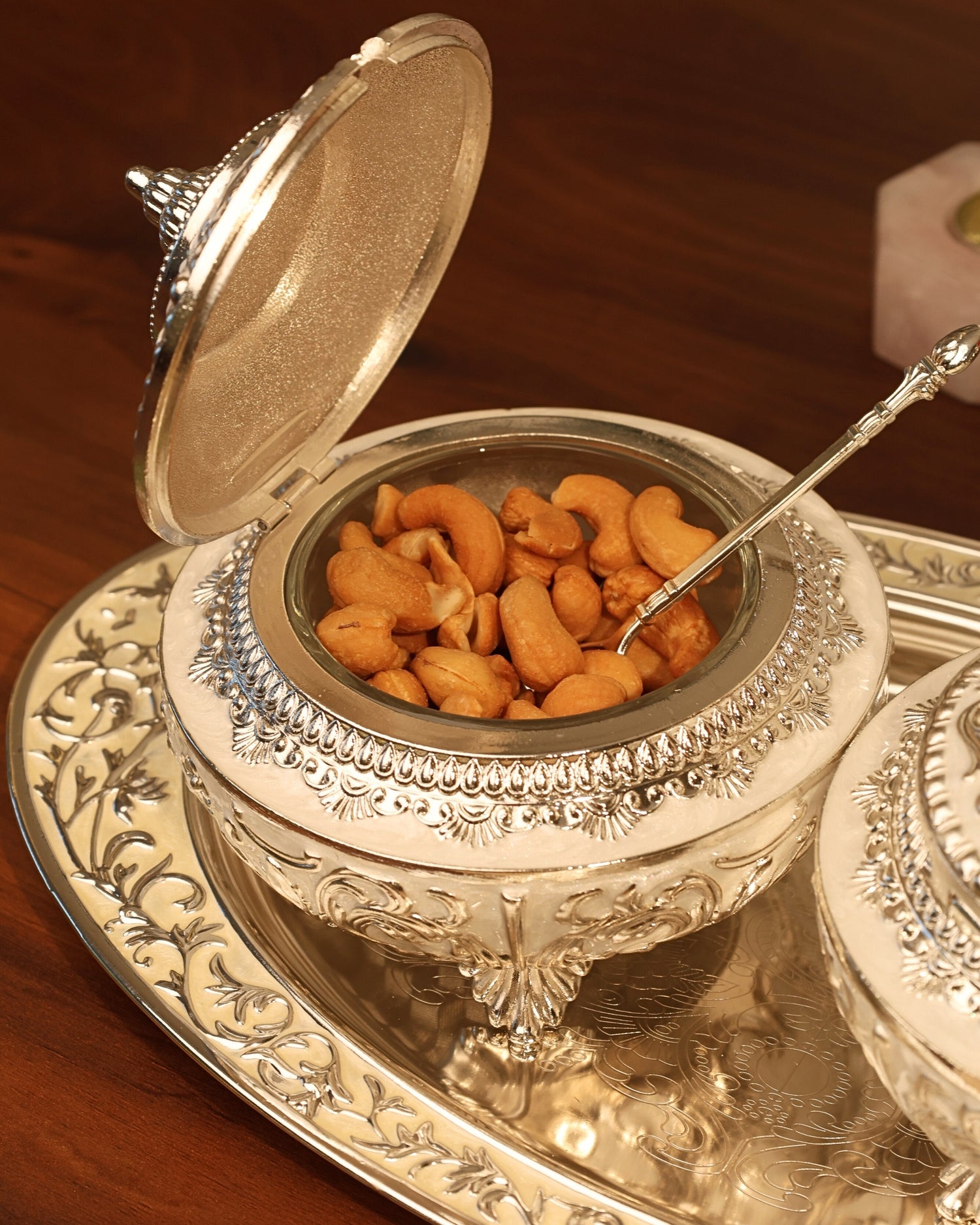 Ornate bowls reminiscent of old times are carefully sculpted and detailed with sinuous floral pattern and a silver structured nob.