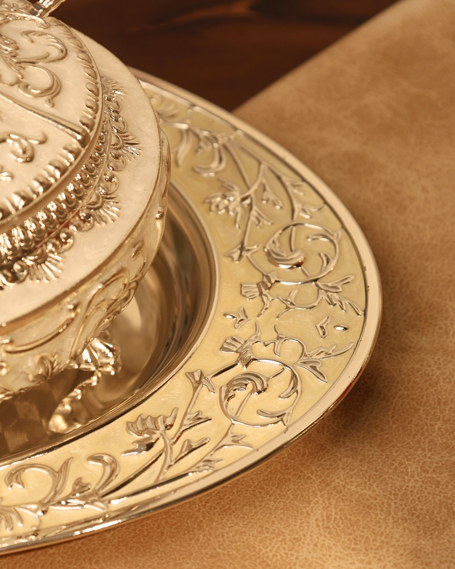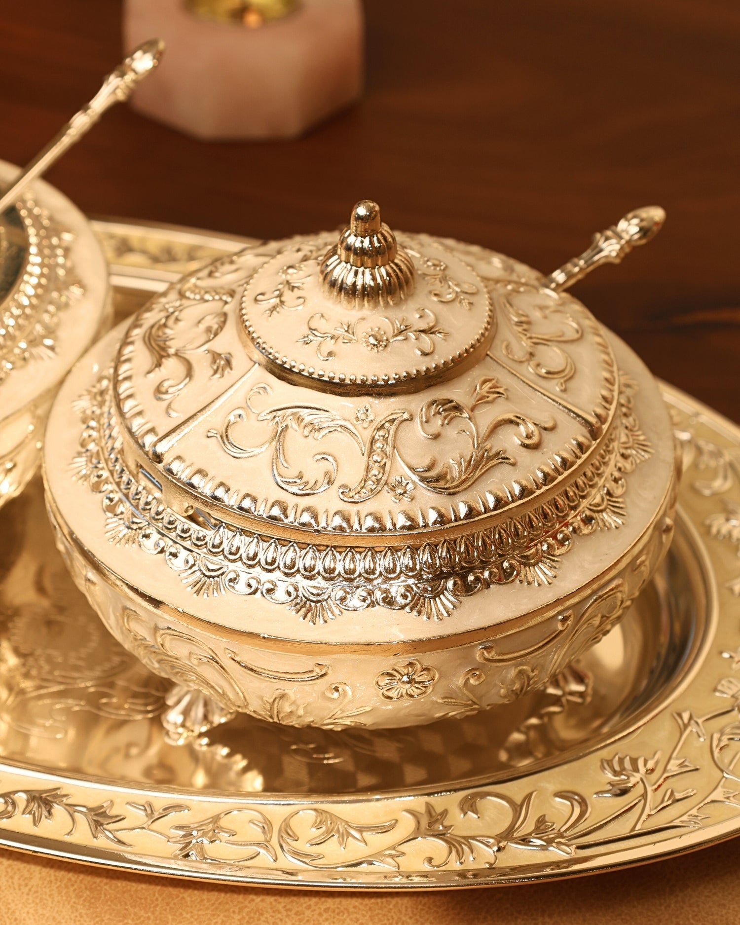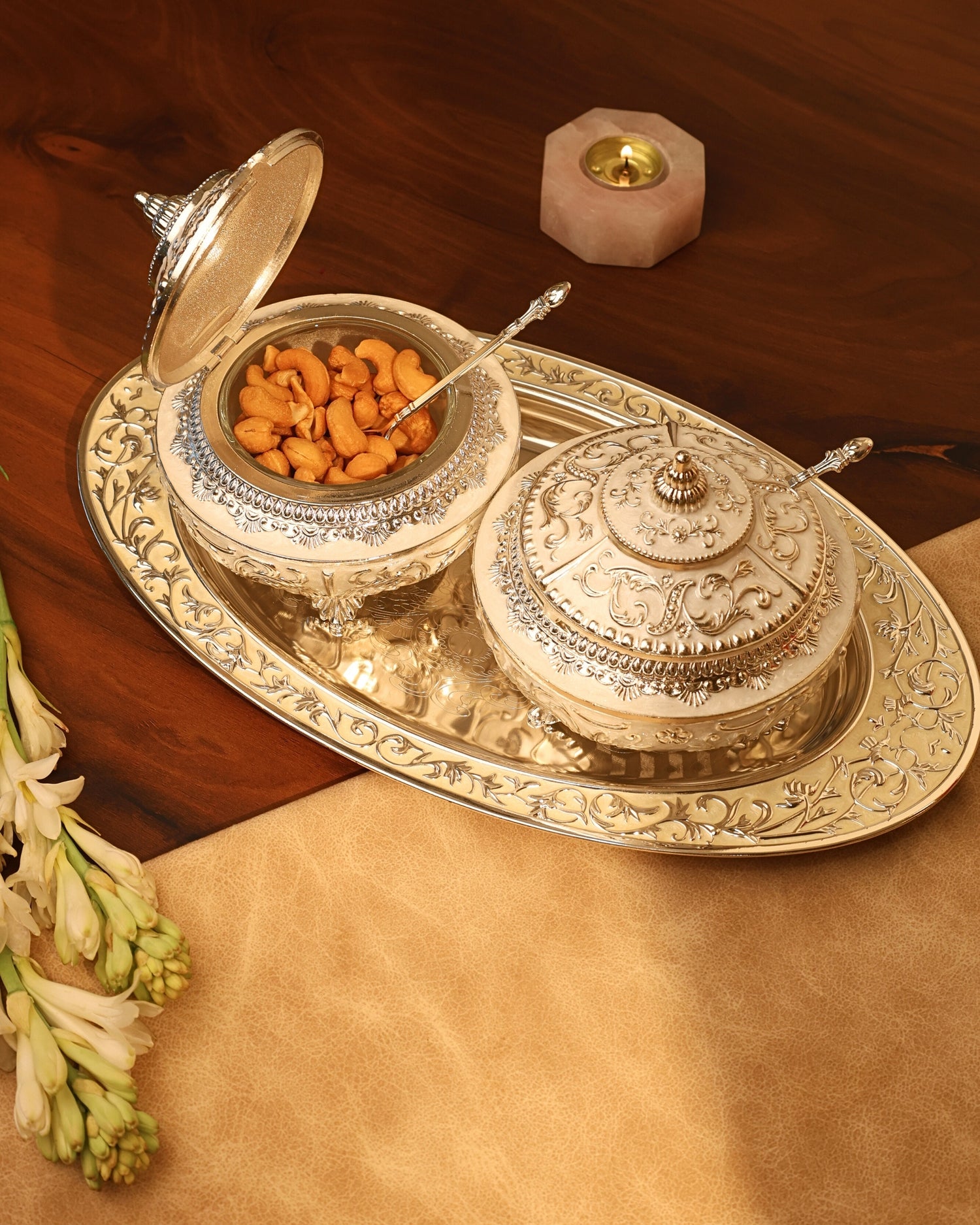 Ornate bowls reminiscent of old times are carefully sculpted and detailed with sinuous floral pattern and a silver structured nob.