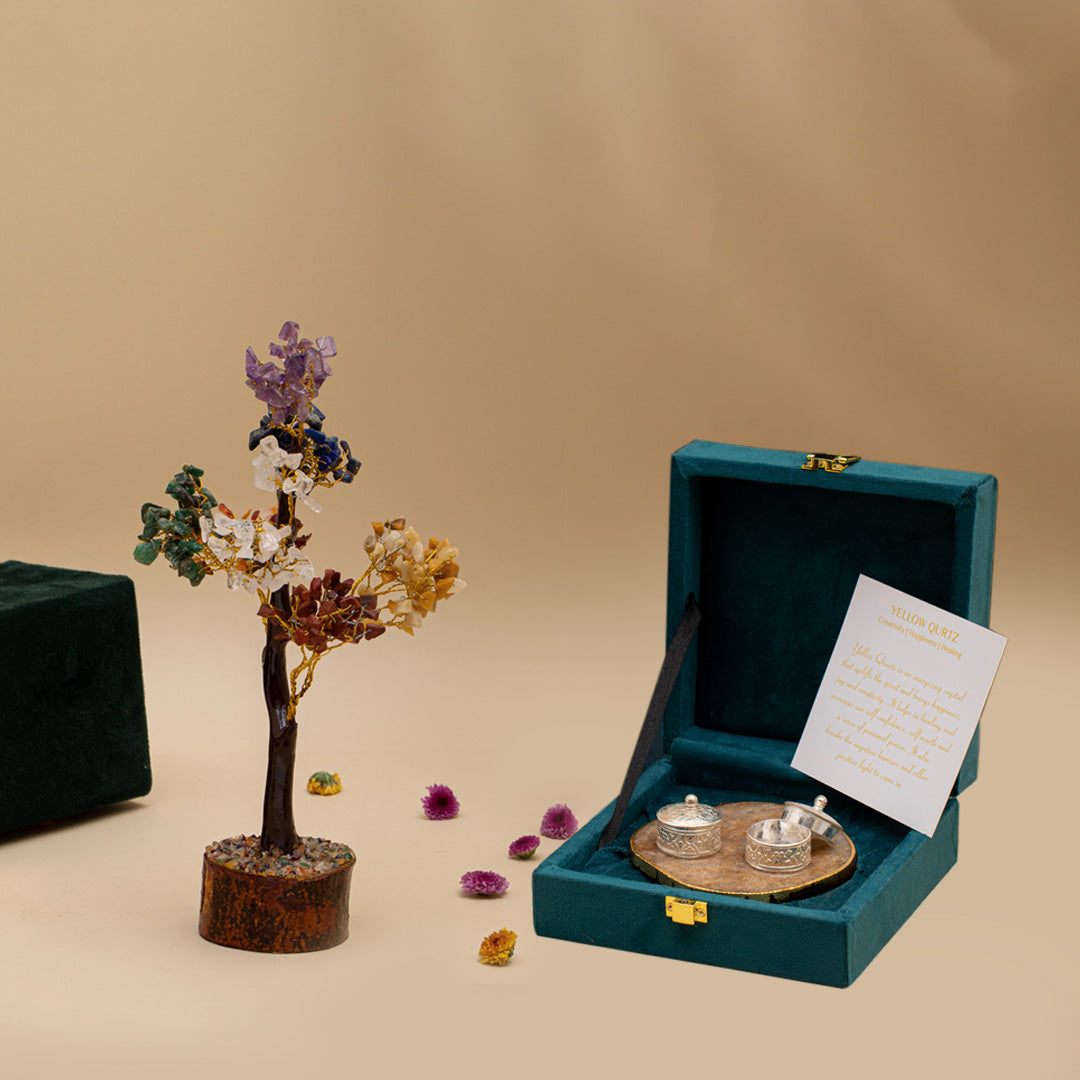 This thoughtful gift set includes a Seven Chakra Crystal Gemstone Tree and a Natural Gemstone Coaster Set. The gemstone tree promotes positivity, aligns energy, and adds charm to any space, while the elegant coasters bring functionality with a touch of natural beauty. A perfect blend of healing and style, this combo is ideal for gifting on any occasion.